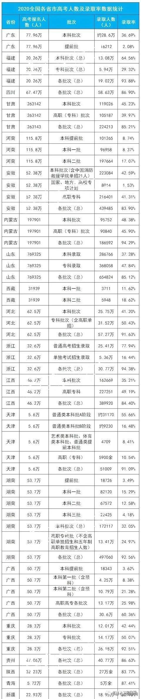 从上述图片可以看出,2019年高考大省有:河南、广东、四川、山东、河北、安徽、湖南,这七个省份的高考参加人数均在50万以上,其中河南省2019年人数直破百万,是人数最少的西藏的近40倍。2020年,几个高考大省参考人数还在持续增加,尤其是河南已经达到115.8万。我们再看看看各个省份具体的录取情况。