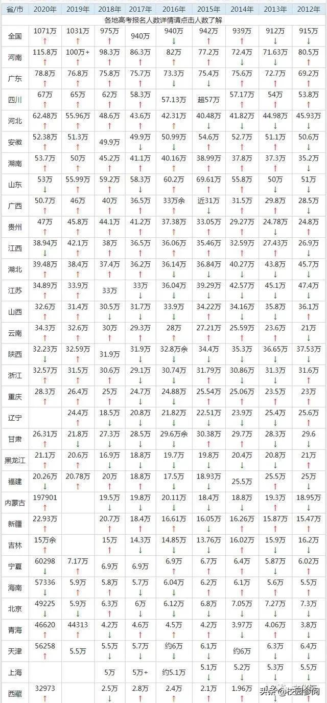 2020年全国高考报考人数1071万,创历史新高。纵观2012年-2020年,高考人数基本呈上升状态,2012年与2013年相差最小,约3万考生,2019年与2020年相差最大,约40万考生。保守估计,2021年高考参考考生逾千万的可能性极大。