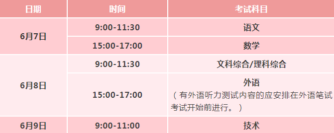 普通类考生全国文化统考于6月7日开始举行,具体科目考试时间安排为: