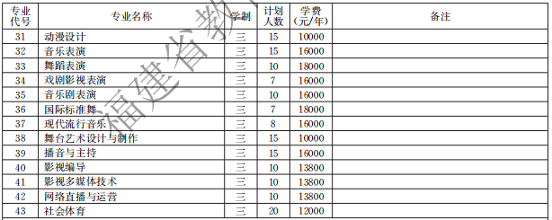 五年专教学部:舞蹈表演专业、音乐表演专业、戏剧影视表演专业、音乐剧表演专业(面向福建省内招收初中毕业生)。