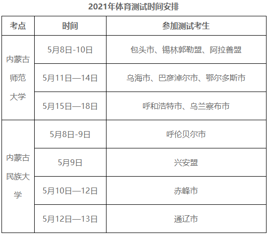 内蒙古关于2021年普通高校招生体育测试时间安排已经公布,下面是详细信息,来看一下!