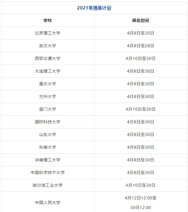 报名时间:目前大都集中在4月8日至30日期间报名,报名时间在20天左右,与2020年相仿。目前看,仍然聚焦在数学、物理、化学、生物、哲学、历史、古文字等基础学科,其中武汉大学开放基础医学专业。