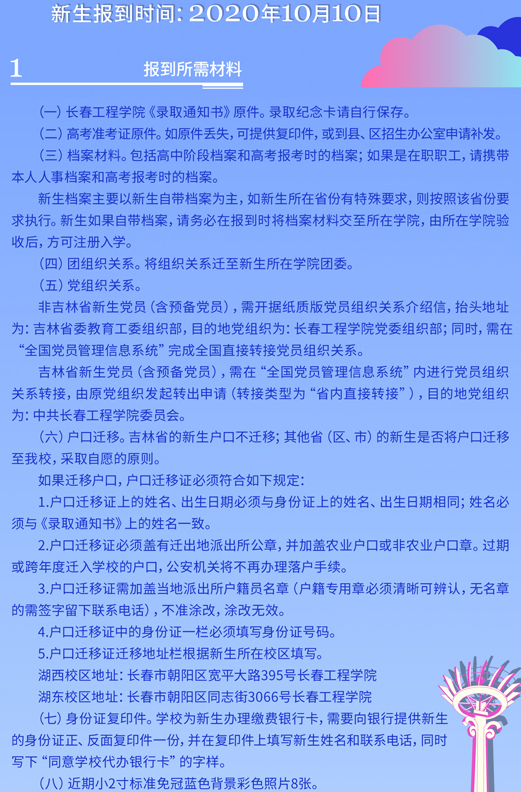 长春工程学院2020年新生报到指南发布,新生报到时间是2020年10月10日,下面是报到具体情况安排,供参考。