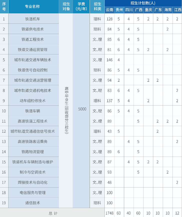 2020年昆明铁道职业技术学院铁道机车、铁道供电技术、铁道工程技术、铁道交通运营管理、城市轨道交通车辆技术、铁道信号自动控制、城市轨道交通机电技术、动车组检修技术专业的学费为5000元/年。