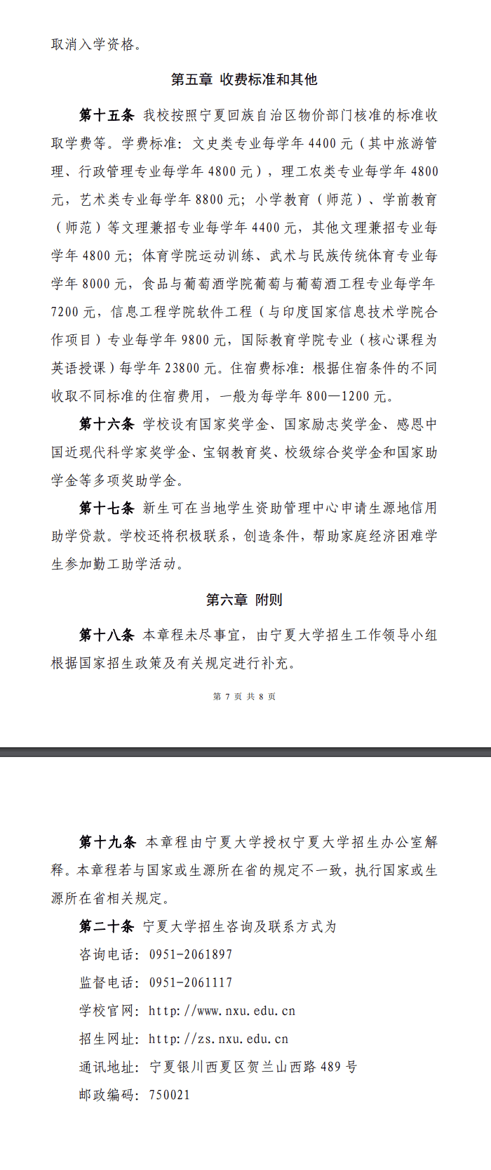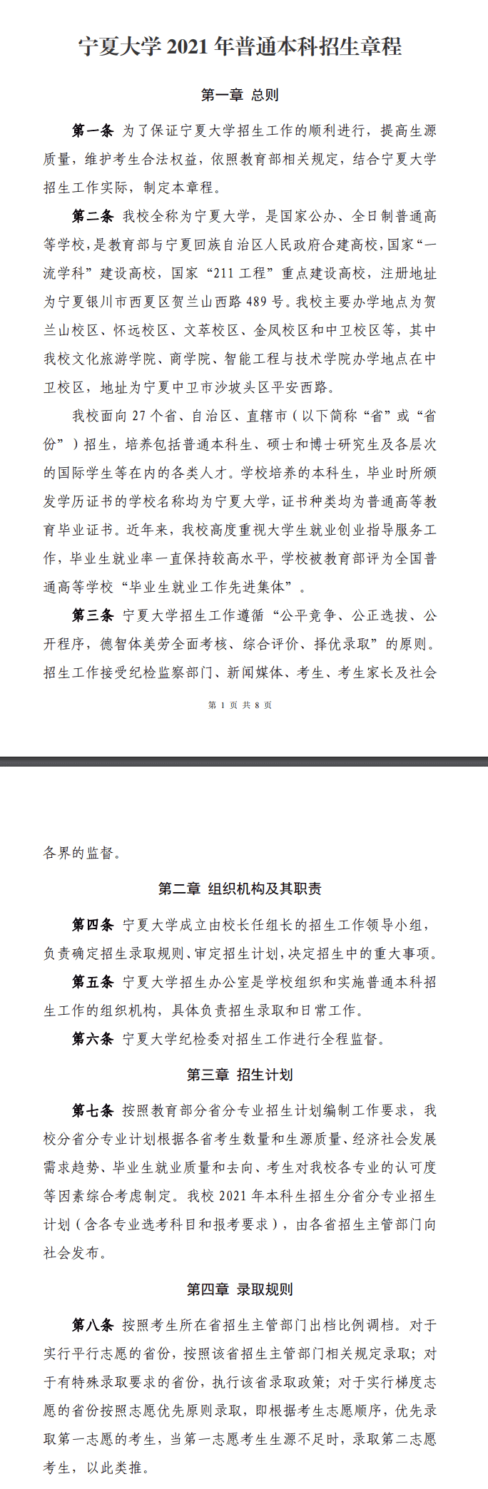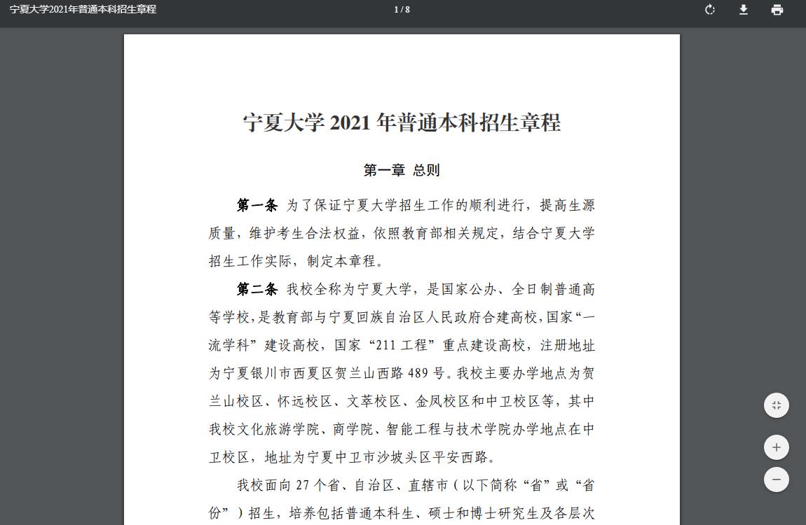 宁夏大学2021年普通本科招生章程 时间:2021-05-06 00:01 招生简章 点击查看:宁夏大学2021年普通本科招生章程.pdf文章来源(官网发布地址):http://zs.nxu.edu.cn/ningxiadaxue2021nianputongbenkezhaoshengzhangcheng.pdf官网发布缓存图(部分):