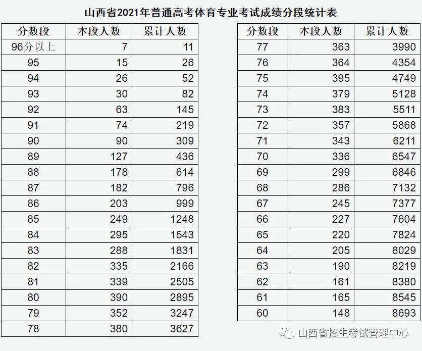 山西:2021年普通高校招生体育专业考试成绩分段统计情况公布