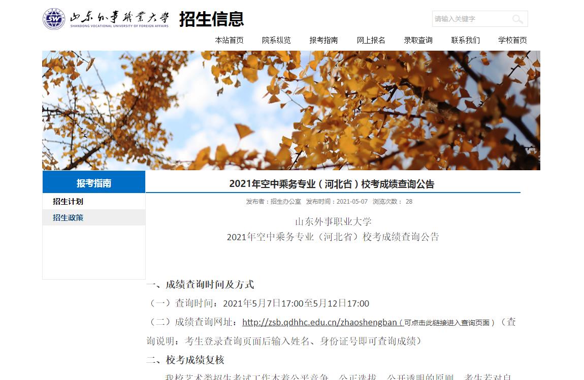 山东外事职业大学2021年空中乘务专业(河北省)校考成绩查询公告