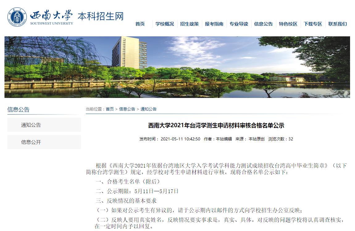 西南大学2021年台湾学测生申请材料审核合格名单公示