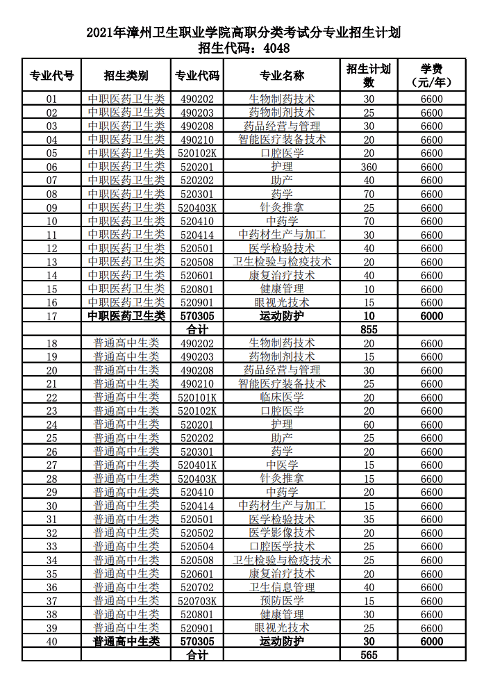 2021年漳州卫生职业学院高职分类考试分专业招生计划