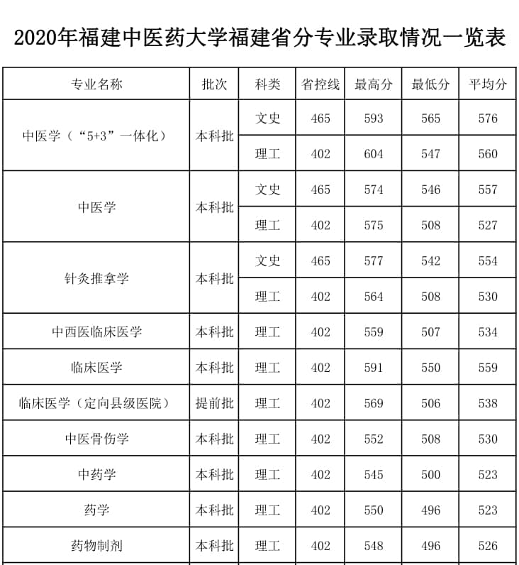 二、福建中医药大学录取分数线2020年汇总
