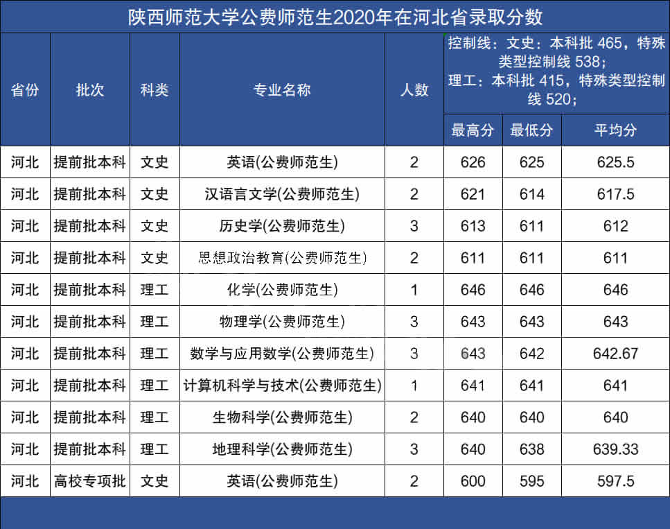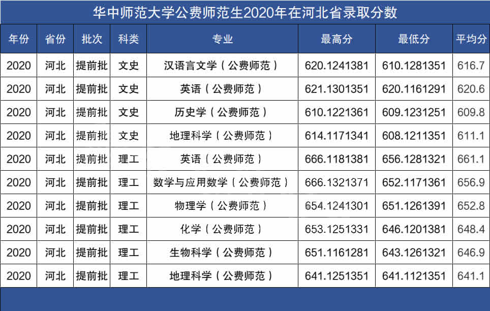 除了省属的河北师范大学外,部属的6所有4所高校(东北师范大学、华中师范大学、西南大学、陕西师范大学)会在河北省招收公费师范生,根据往年的招录情况显示,2020年国家公费师范生在河北省录取分数如下: