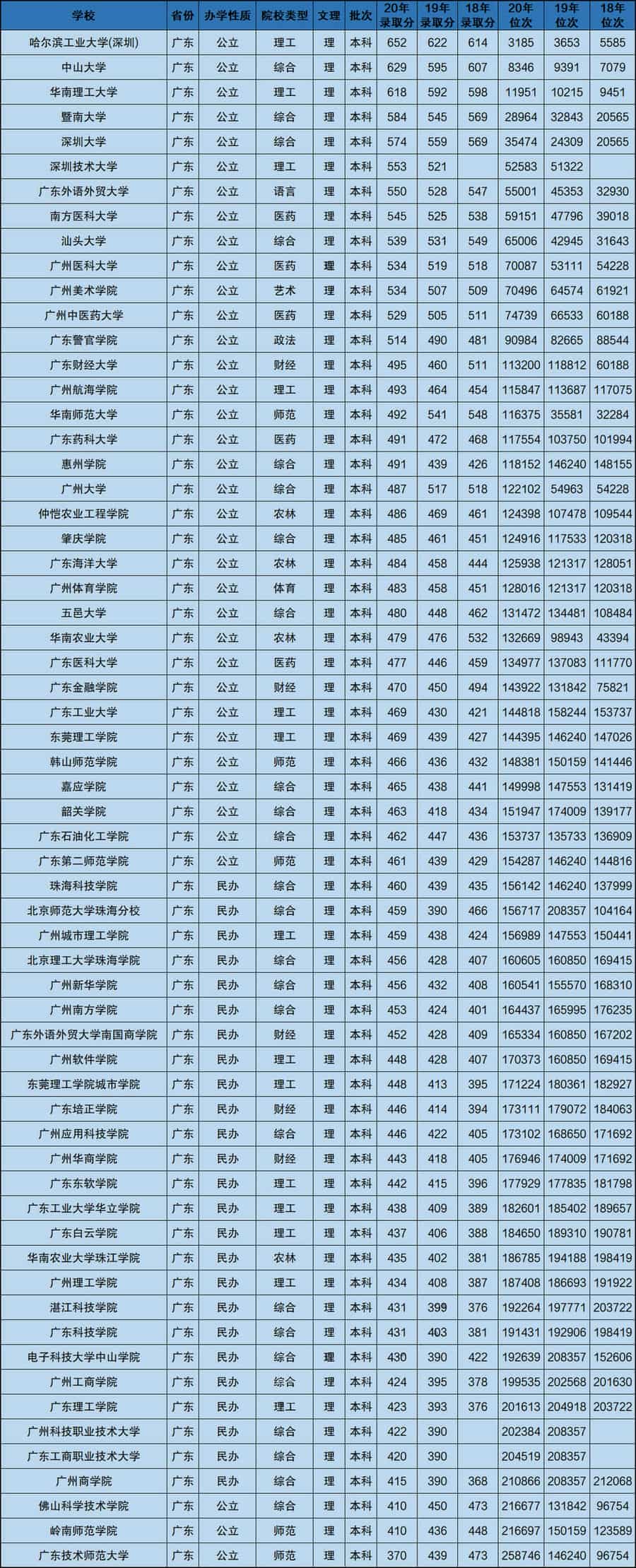 录取分数位于600分之上的学校还有两所,分别是中山大学629分、华南理工大学618分。这两所高校都是985工程、211工程大学,属广东工商职业技术大学、广州商学院、佛山科学技术学院、岭南师范学院和广东技术师范大学。其中只有广东技术师范大学的录取分数低于400分,为370分。不过从小编搜集到的信息来看,该分数录取的为少数民族政策考生,普通类考生的最低录取分数为468分。