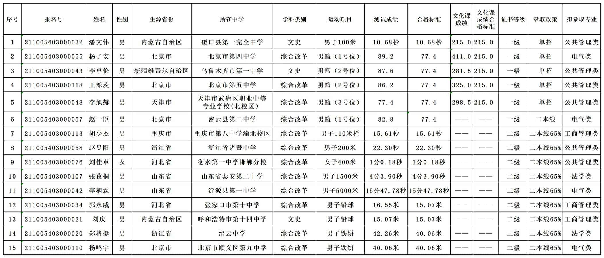 按照教育部和我校高水平运动队招生工作相关规定,学校在对考生进行初审、测试的基础上,结合学校高水平运动队建设和发展的整体需要以及考生的测试成绩和文化课统考成绩,分项目择优确定以下拟录取资格名单。现将测试合格名单信息予以公示。