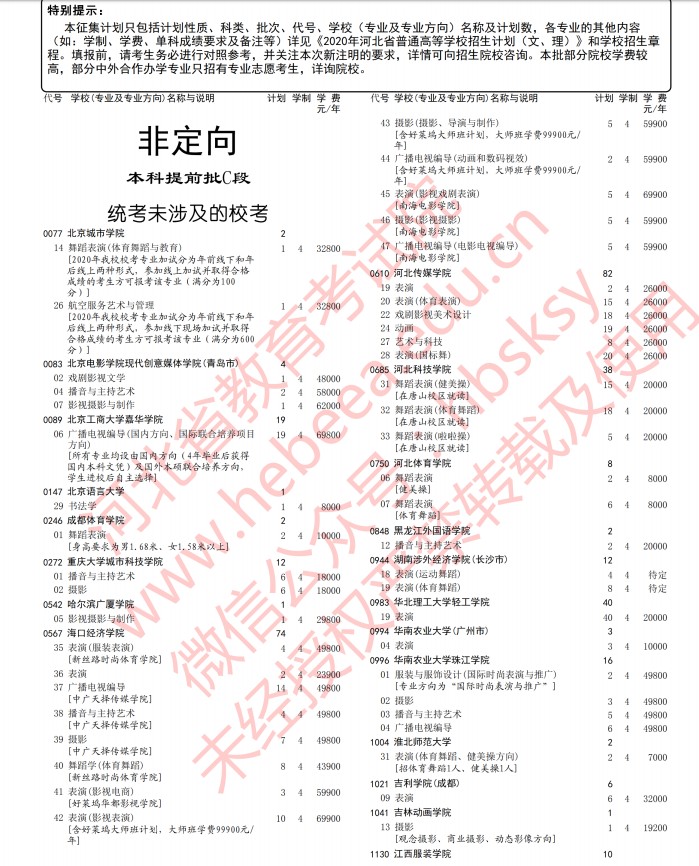 河北2020本科提前批C段二志愿征集志愿招生计划