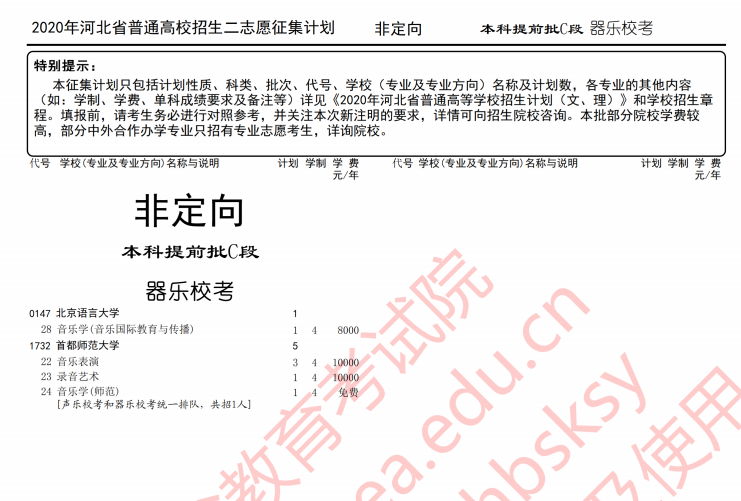 2020年河北高考本科提前批C段征集志愿招生计划(器乐校考)