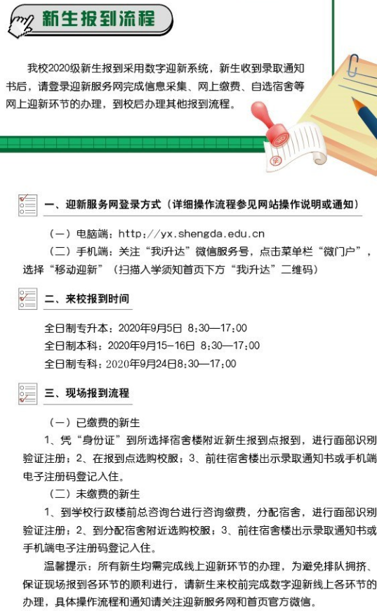 2020年郑州升达经贸管理学院入学须知发布,全日制本科报到时间是9月15日-16日,专科报到时间是9月24日。