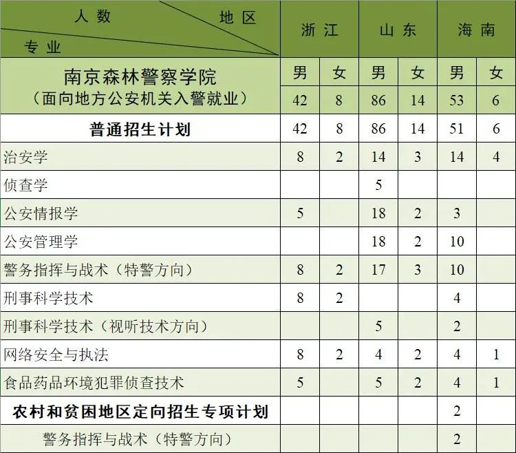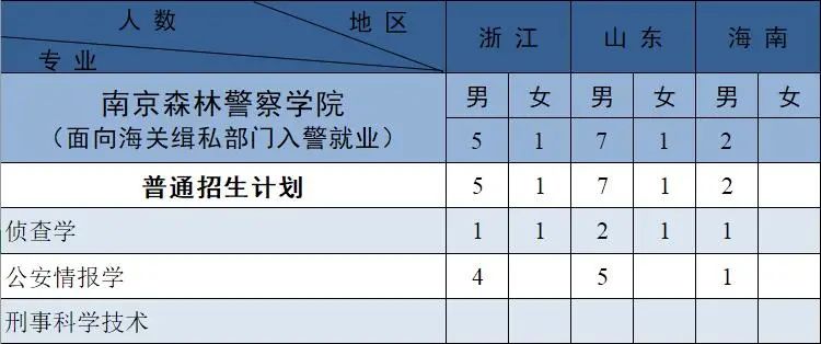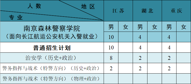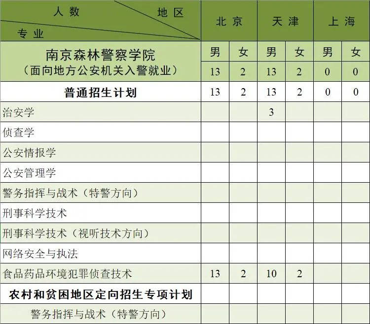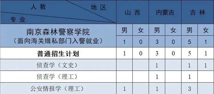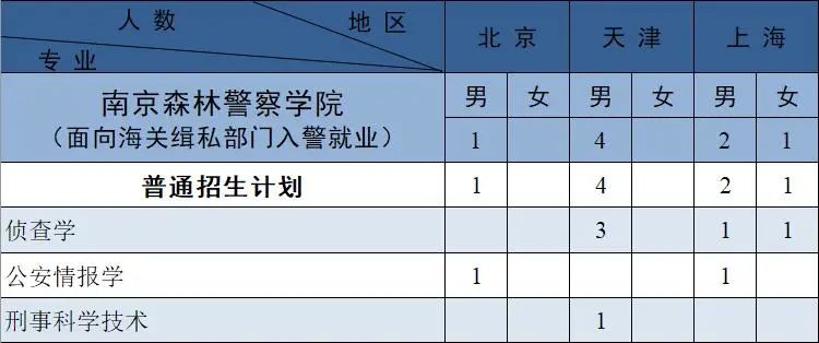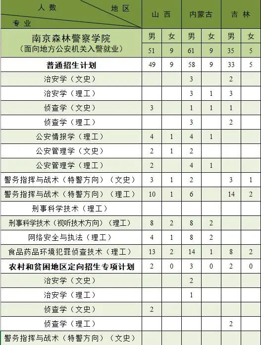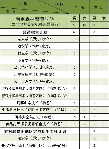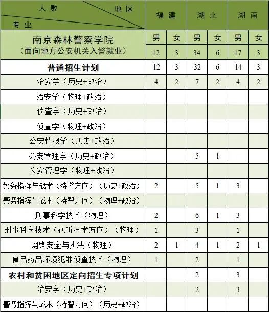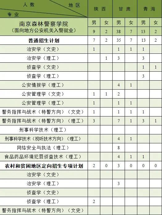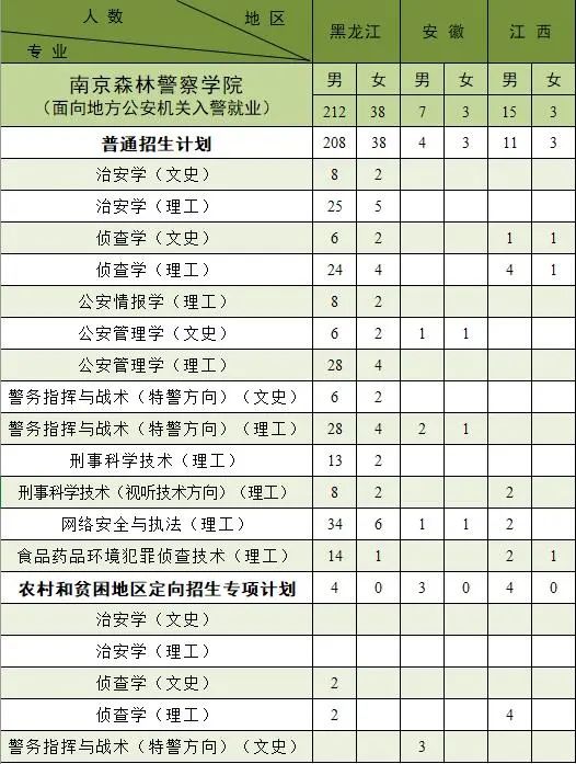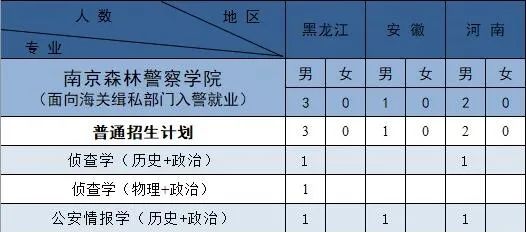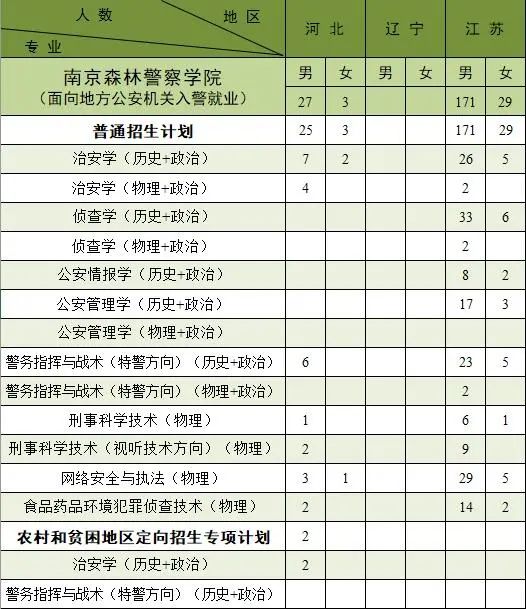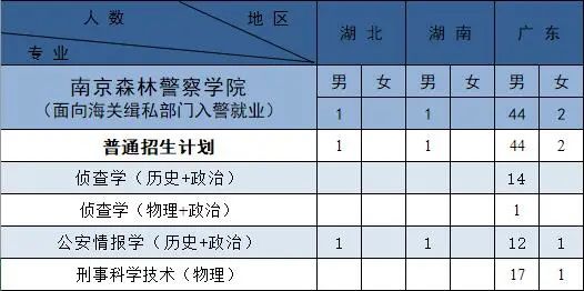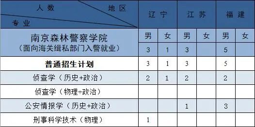 1、新疆计划中含新疆高中班计划 10 人。其中:男生 9 人,即治安学(文史)1 人、治安学(理工)1 人、侦查学(文史)1 人、侦查学(理工)2 人、食品药品环境犯罪侦查技术(理工)4 人;女生 1 人,即食品药品环境犯罪侦查技术(理工)1 人。
