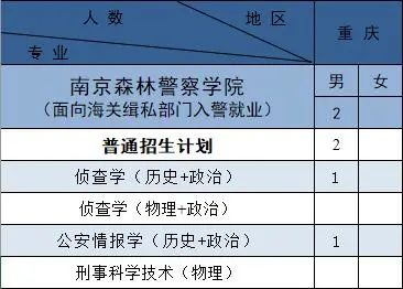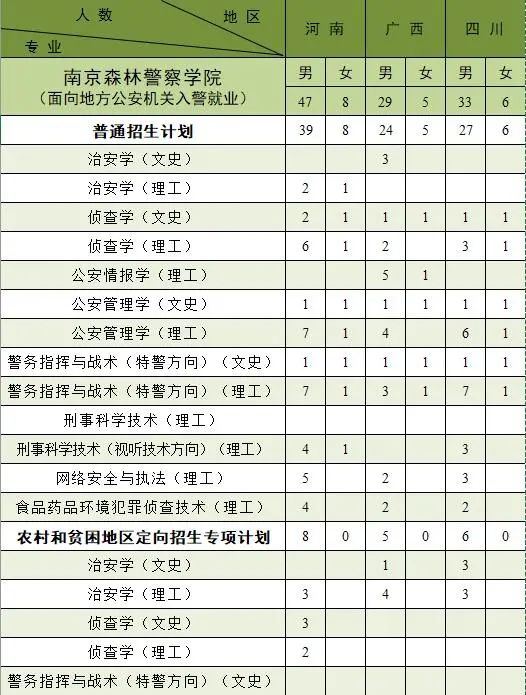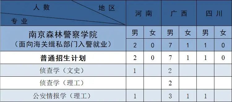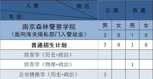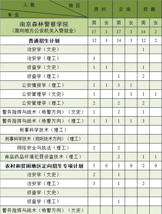 以上计划中含定向艰苦边远地区单位工作的招生计划共 7 人。其中:广西 4 人,即侦查学(文史)2 人、侦查学(理工)2 人;西藏 1 人,即侦查学(理工)1 人;新疆 2 人,即侦查学(文史)1 人、侦查学(理工)1 人。