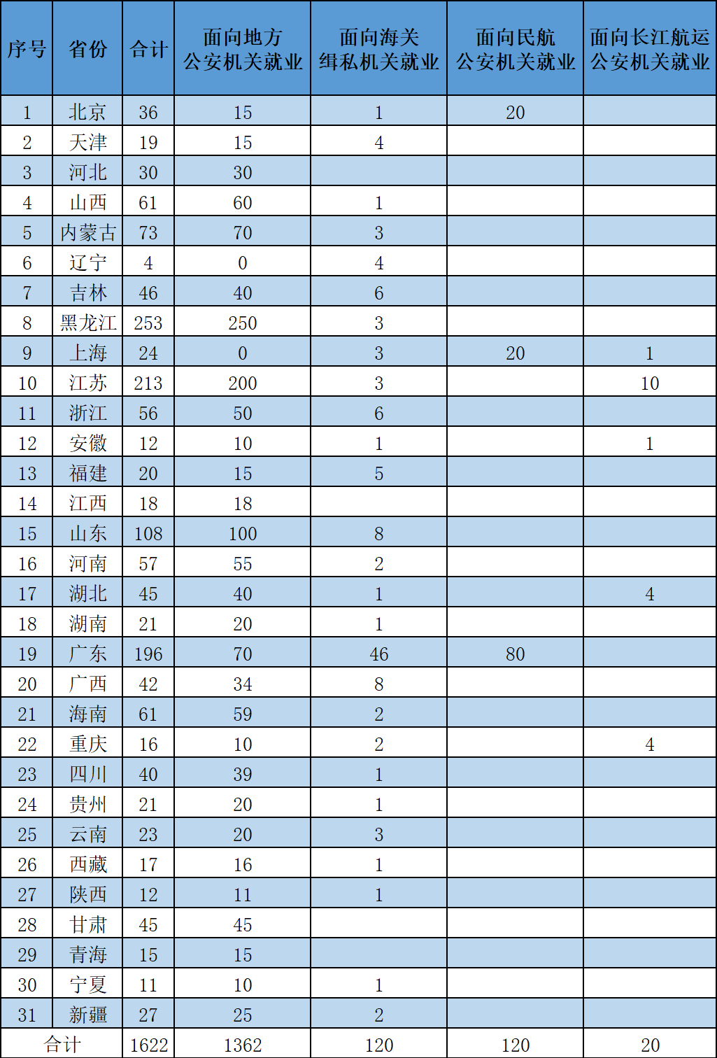 经报送公安部、教育部核准,我校2021年面向全国31个省(自治区、直辖市)和垂直管理部门招生1622名,现面向社会发布。分省分专业计划编制情况如下: