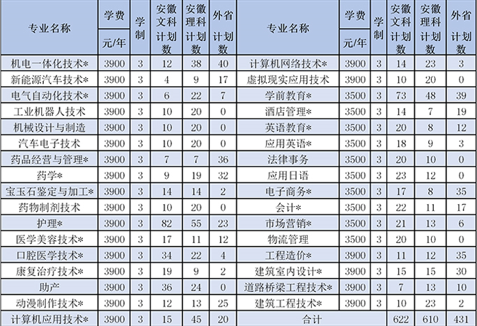 2020年淮南联合大学机电一体化技术、新能源汽车技术、电气自动化技术、工业机器人技术、机械设计与制造、汽车电子技术、药品经营与管理、药学、药物制剂技术和护理专业的学费为3900元/年。