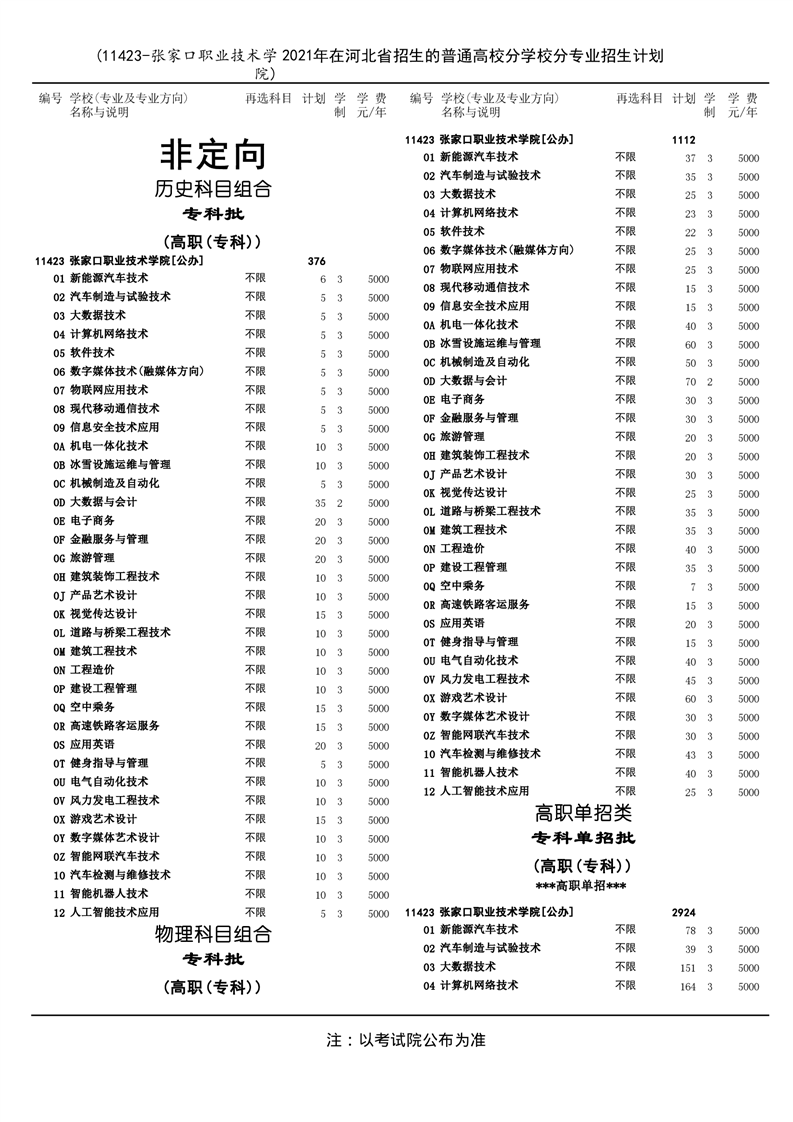 张家口职业技术学院2021年河北省招生计划