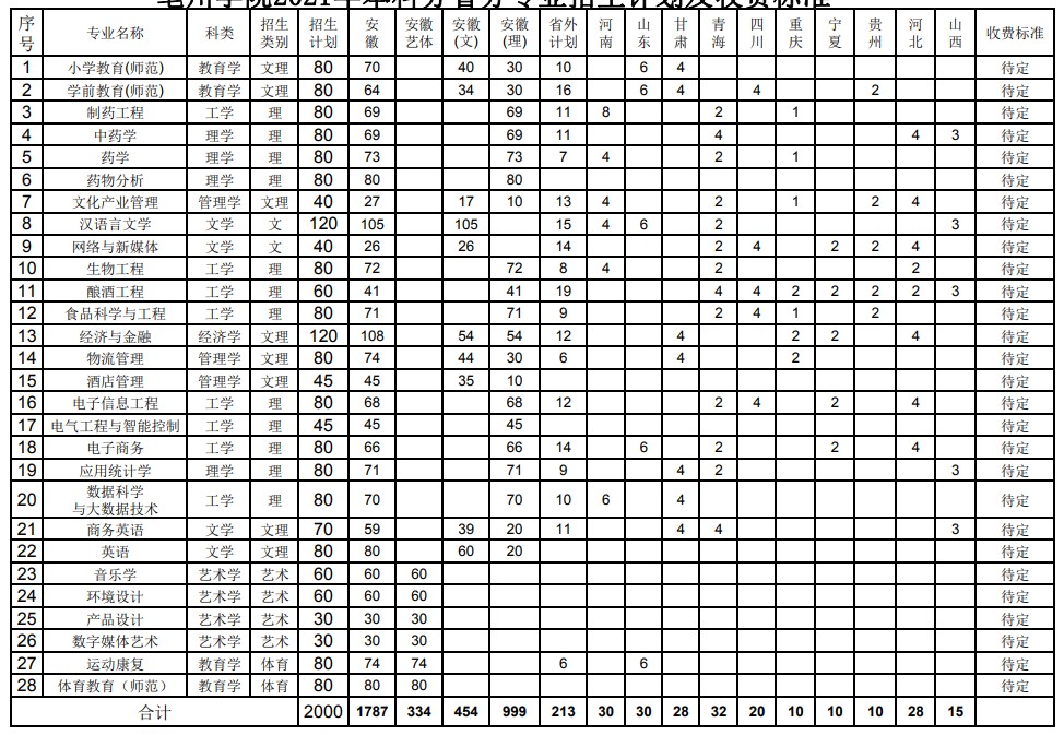 2021亳州学院各省招生专业及招生计划已经公布,小编整理了相关信息,来看一下!