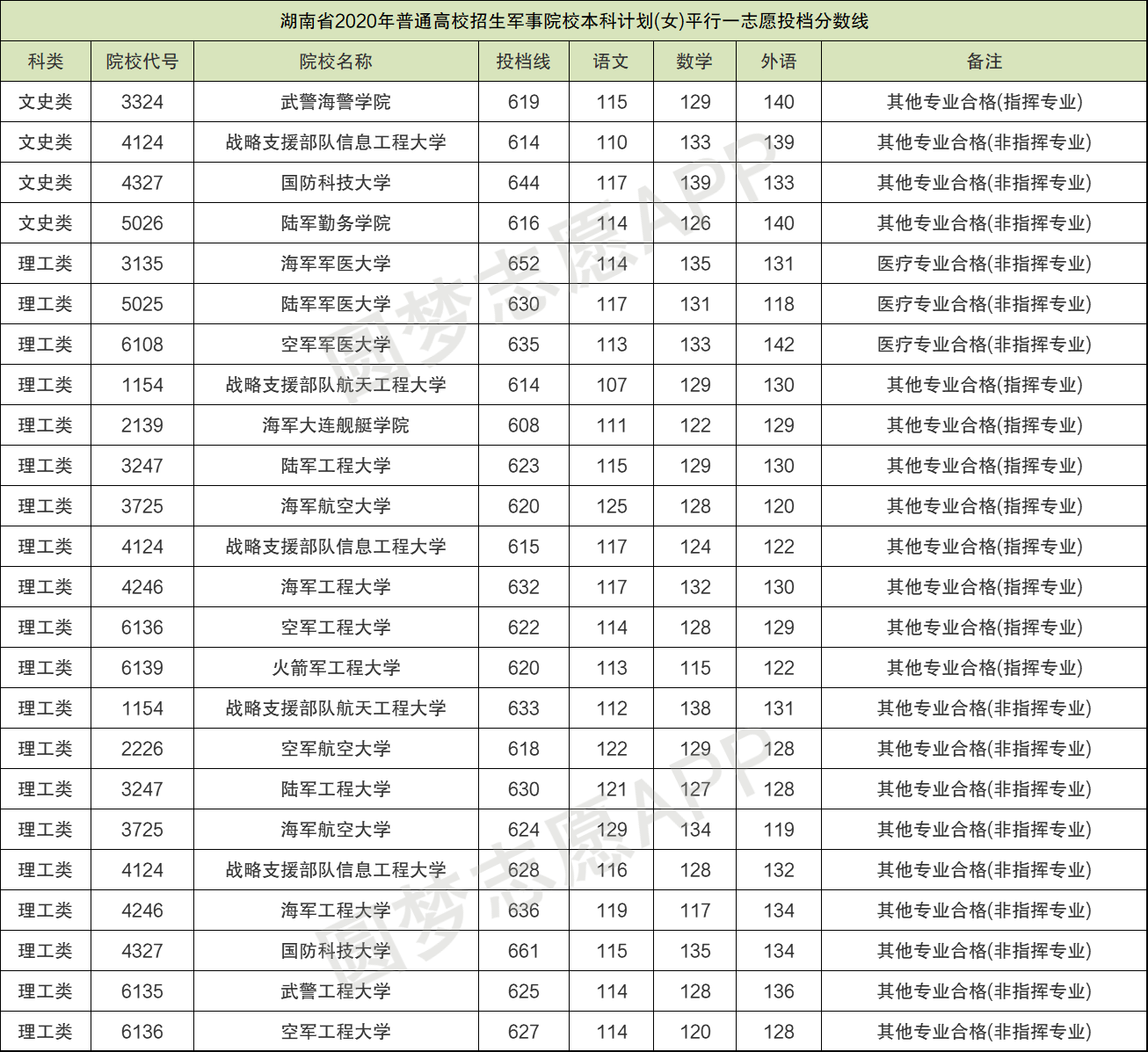 在湖南省招收文史类女生录取分数最低的军校是战略支援部队信息工程大学,20年投档线为614分;录取分数线最高的军校是国防科技大学,20年投档线为644分;在湖南省招收理工类女生录取分数最低的军校是海军大连旗舰学院,20年投档线为608分;录取分数最高的军校是国防科技大学,20年投档线为661分。