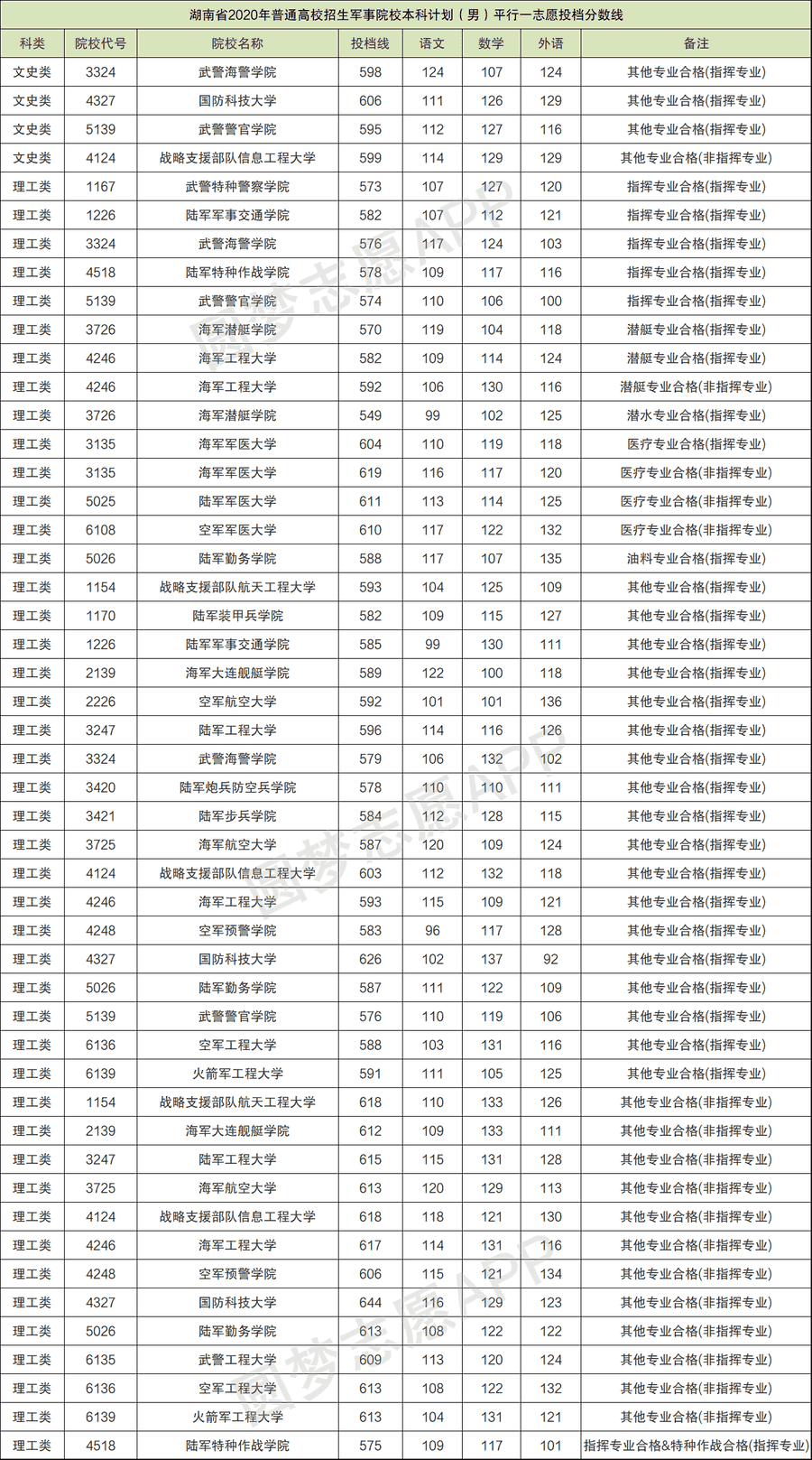 在湖南省招收文史类男生录取分数最低的军校是武警警官学院,20年投档线为595分;录取分数线最高的军校是国防科技大学,20年投档线为606分;在湖南省招收理工类男生录取分数最低的军校是海军潜艇学院(潜水专业合格(非指挥专业)),20年投档线为549分;录取分数最高的军校是国防科技大学,20年投档线为644分。