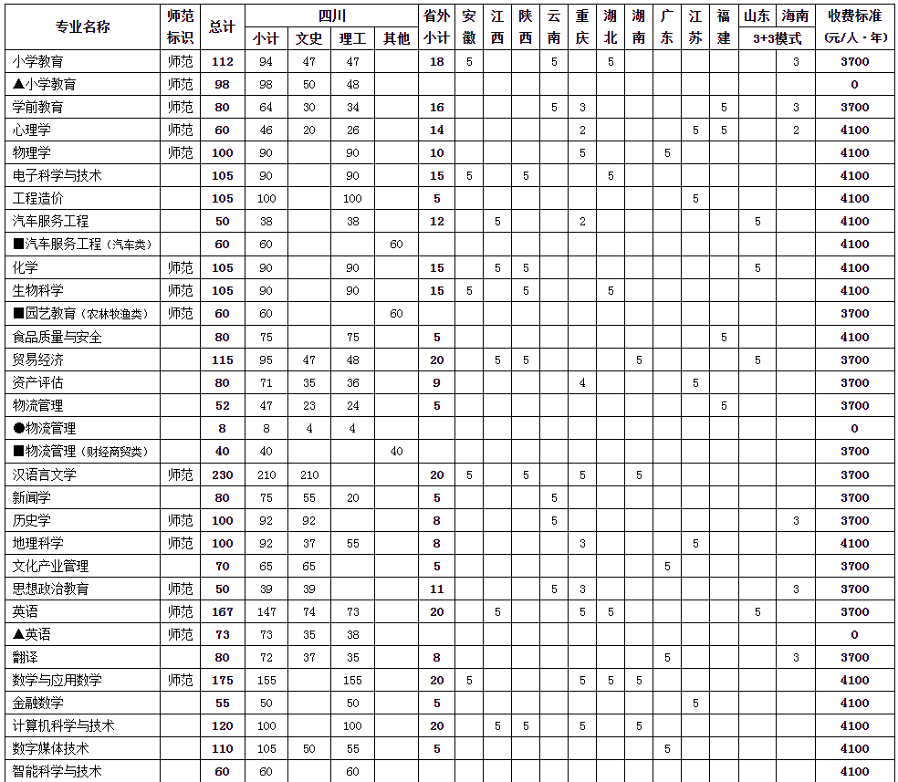 以上为成都师范学院在部分省市招生计划及人数,其它省市招生计划详见学校官网。
