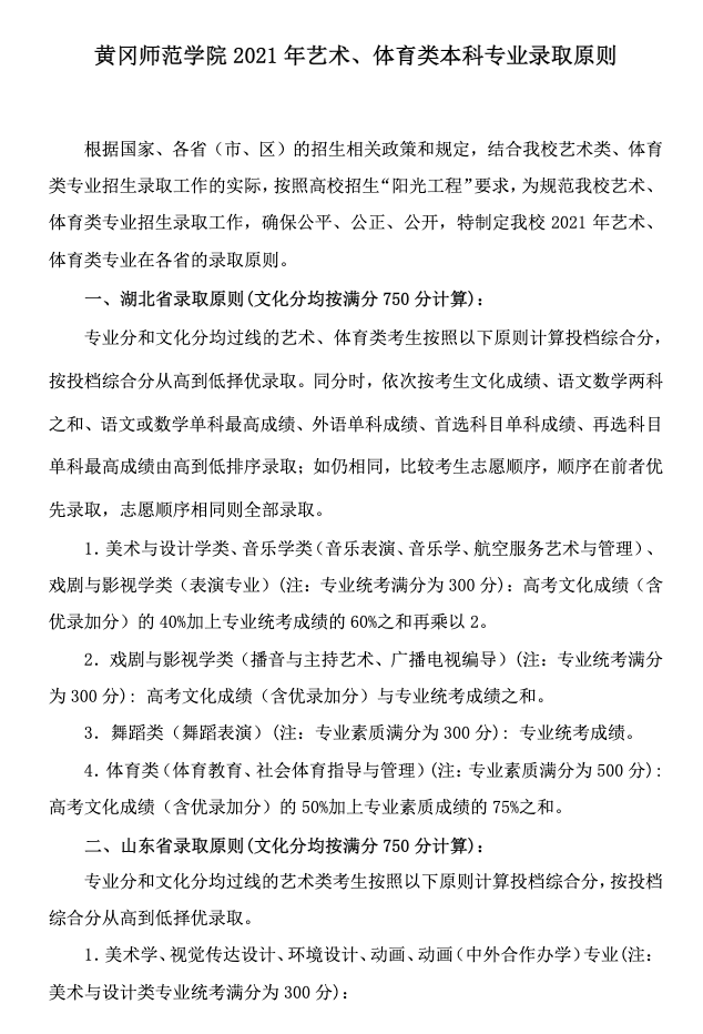 黄冈师范学院2021年艺术体育类专业录取原则