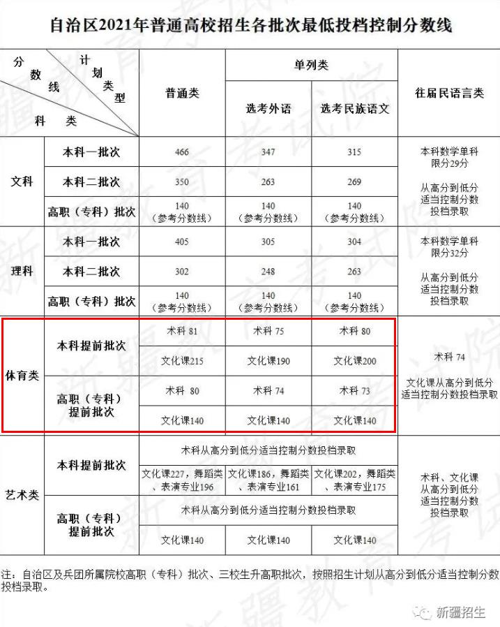 2021年新疆高考录取分数线已公布,关于体育类批次最低录取控制分数线公布如下: