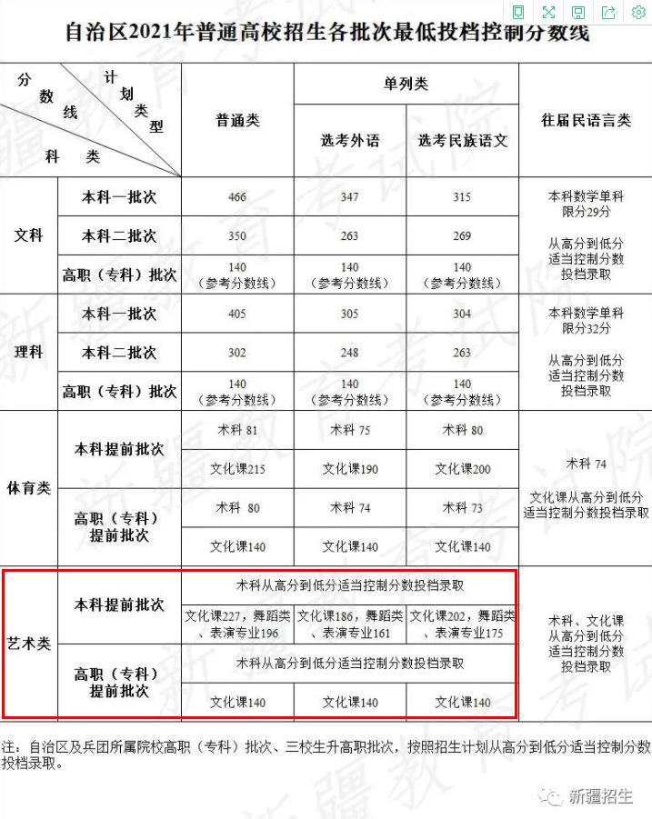 2021年新疆高考录取分数线已公布,关于艺术类批次最低录取控制分数线公布如下:
