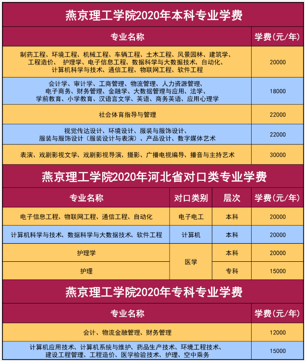 2020燕京理工学院学费多少钱 时间:2020-09-04 15:57 高校名单 2020年燕京理工学院相关学科收费标准已出,理工类专业20000元/年,文科类专业18000元/年,具体如下表,仅供参考。燕京理工学院收费标准燕京理工学院海外合作项目燕京理工学院成人高考学费燕京理工学院高职单招学费