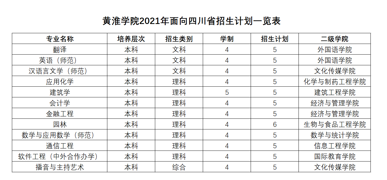 黄淮学院2021年面向四川省招生计划一览表