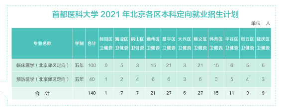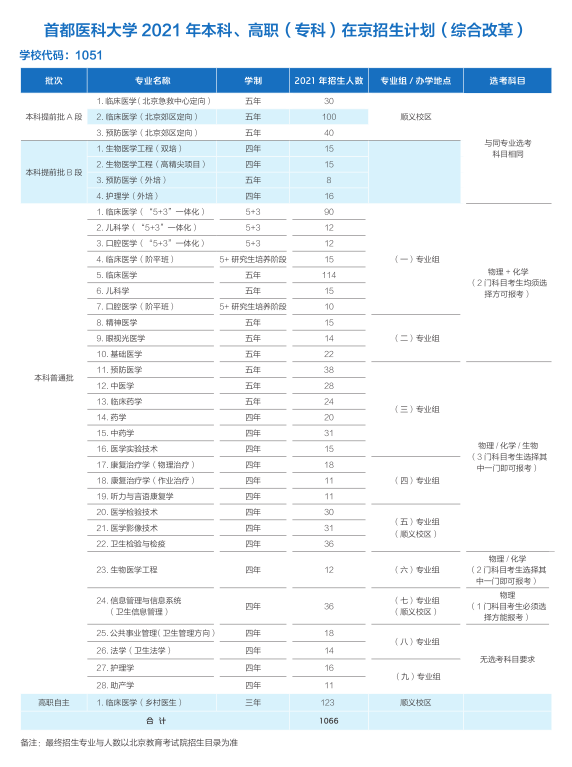 首都医科大学2021年本科、高职(专科)在京招生计划(综合改革)