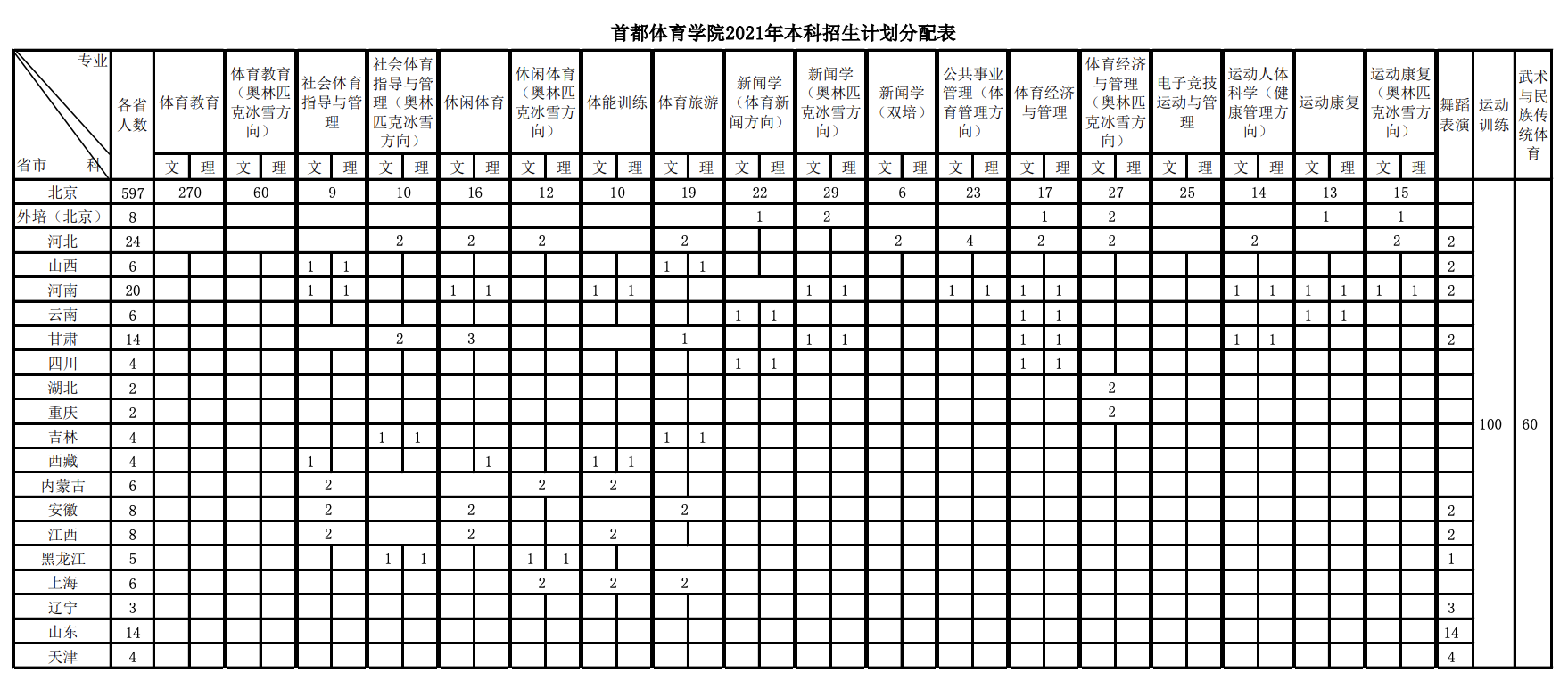 首都体育学院2021年本科招生计划分配表