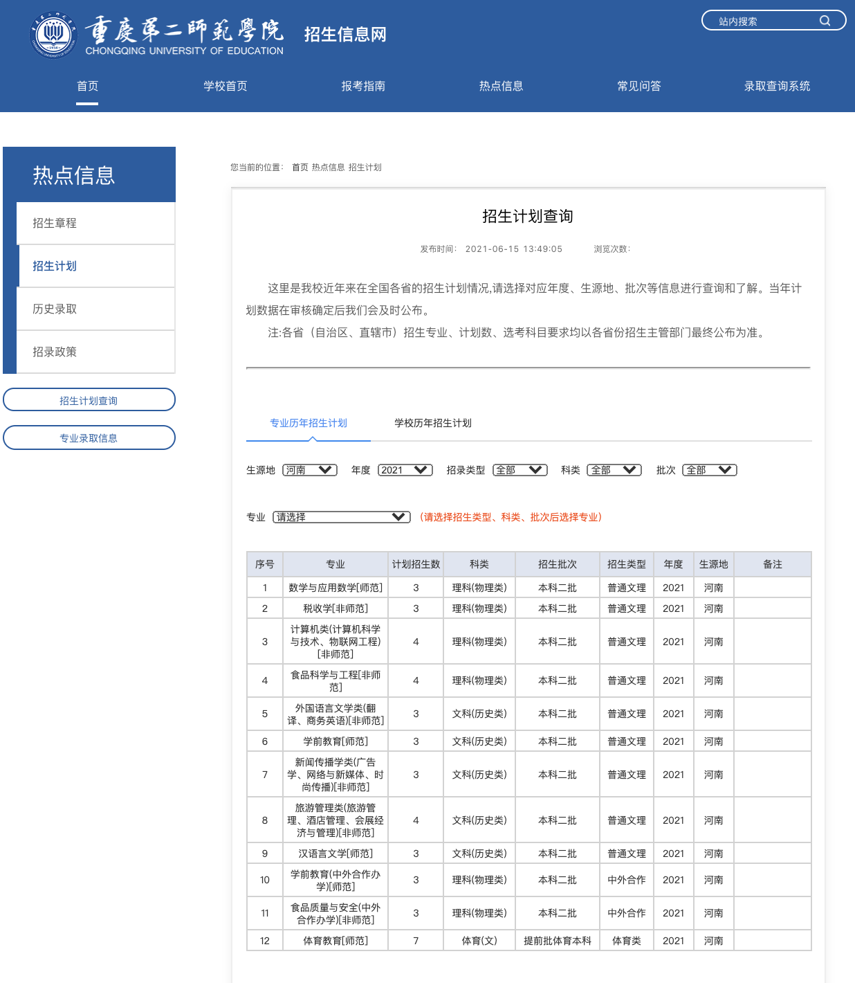 点击查询:重庆第二师范学院2021年各省市招生计划