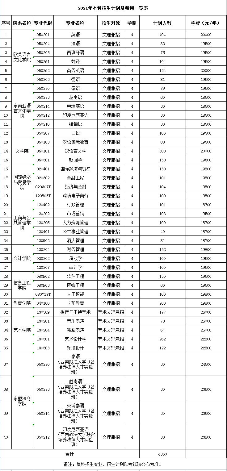 2021高考填报志愿时,广西外国语学院学费多少钱一年、各专业收费标准是怎样的是广大考生和家长朋友们十分关心的问题,为了方便大家查询,mksports -已经为大家整理好了广西外国语学院收费标准,包含各专业学费、住宿费等信息,供大家参考,如有变动,以学校官方最新消息为准。