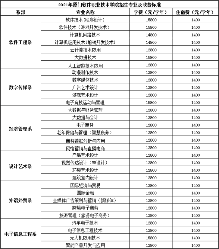 一、厦门软件职业技术学院收费项目及收费标准2021学费标准为:12800、14800、15800元/学年;艺术类为12800元/学年。