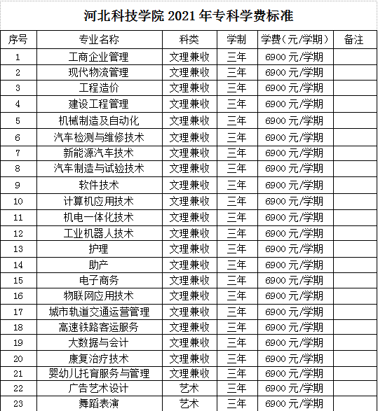 一、2021河北科技学院收费项目及收费标准(一)学费:
