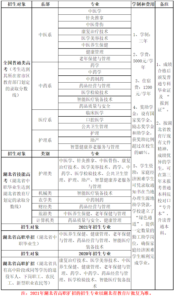 2021湖北中医药高等专科学校学费-各专业收费标准