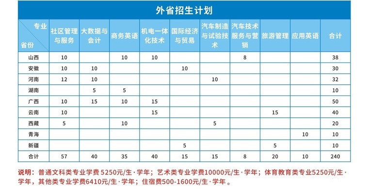 文科类专业学费5250元/生·学年;艺术类专业学费10000元/生·学年;体育教育类专业学费5250元/生·学年;其他专业6410元/生·学年;住宿费500-1600元/生·学年。