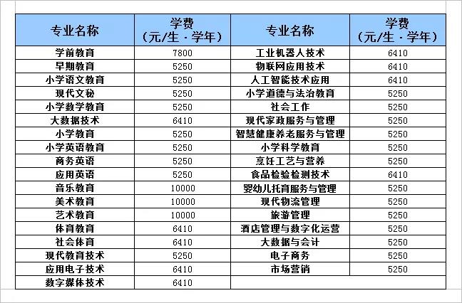 普通文理科类(不含学前教育)专业学费5250-6410元/生学年;
