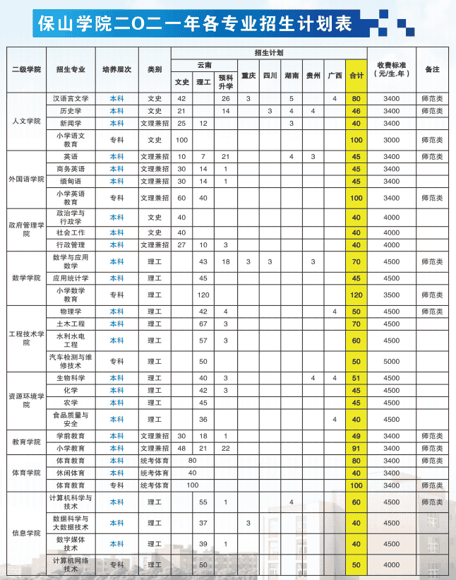 2021年保山学院各专业招生计划表