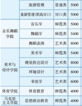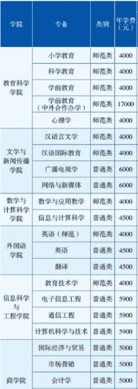 普通类专业学费为4000-6000元/年;师范类专业学费基本上为4000元/年;中外合作办学类专业学费为17000元/年;艺术类专业学费为5400-8000元/年;体育类专业学费为4000元/年。