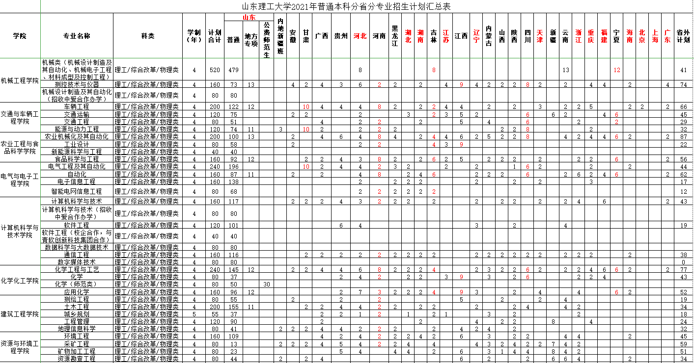 2021年山东理工大学招生计划已经公布,以下是山东省及全国各专业招生人数,这是填报志愿时非常重要的参考数据,供大家参考,如有变动,以学校官方公布为准: