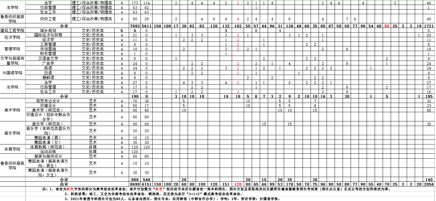 山东理工大学2021年普通本、专科分省分专业招生计划汇总表
