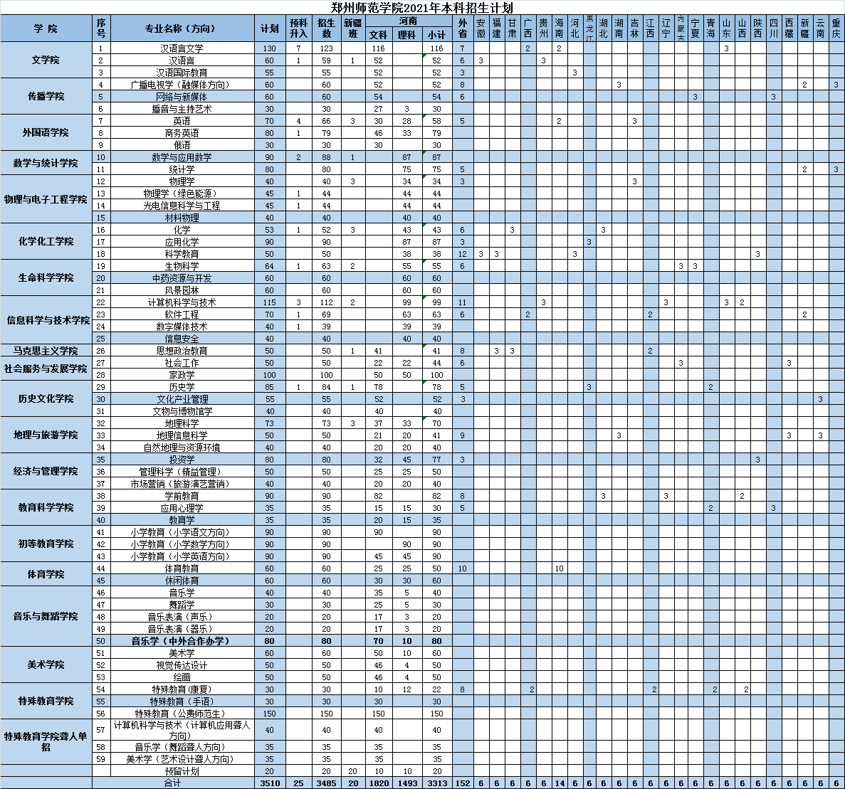 2021年郑州师范学院招生计划已经公布,以下是河南省及全国各专业招生人数,这是填报志愿时非常重要的参考数据,供大家参考,如有变动,以学校官方公布为准: