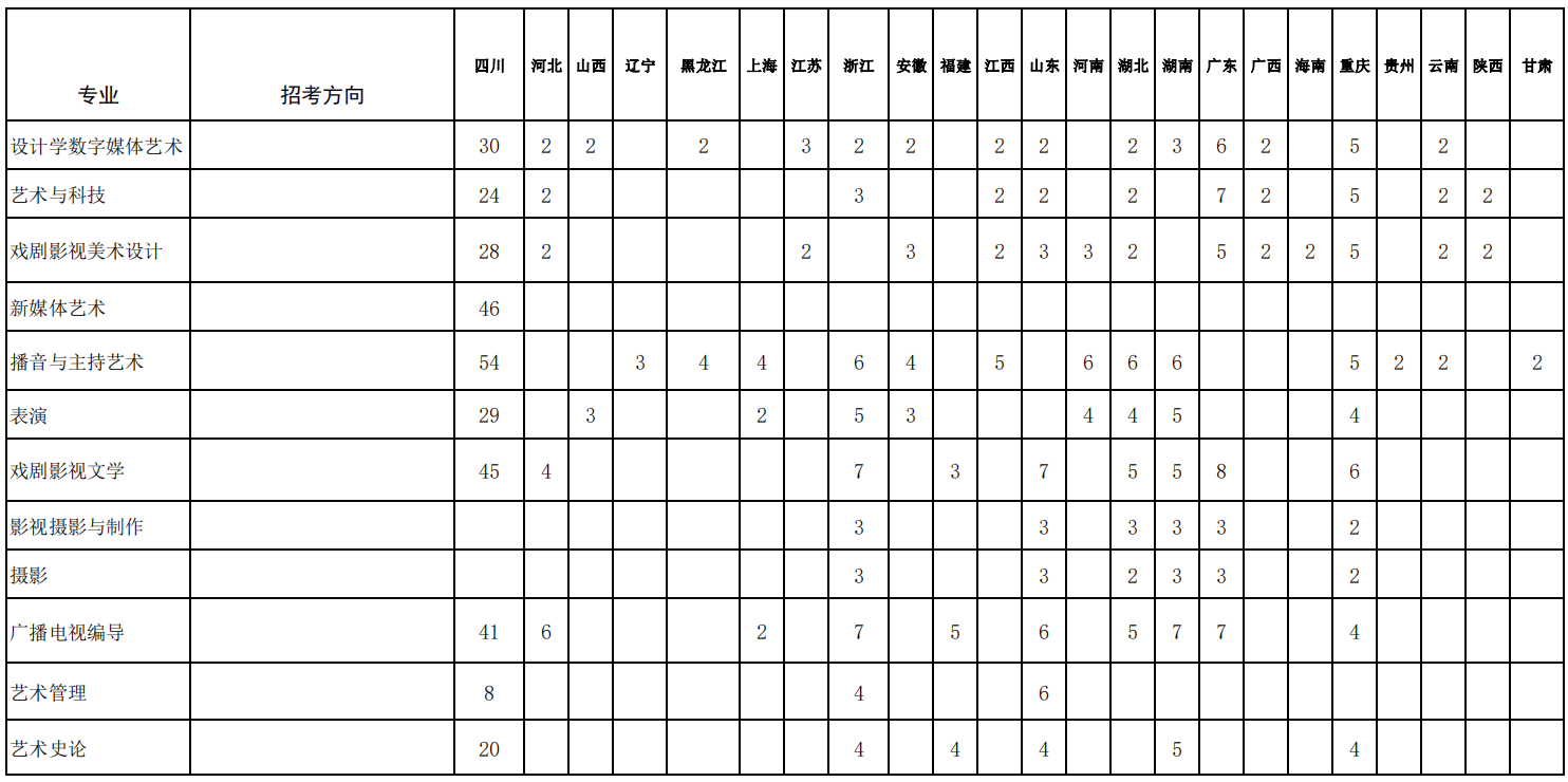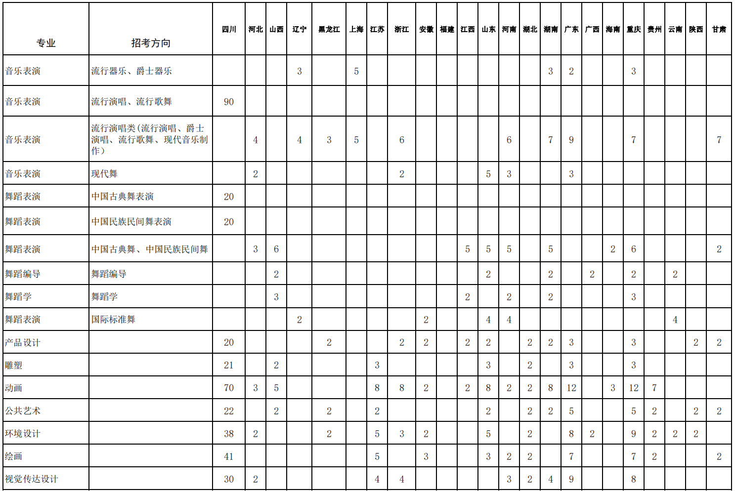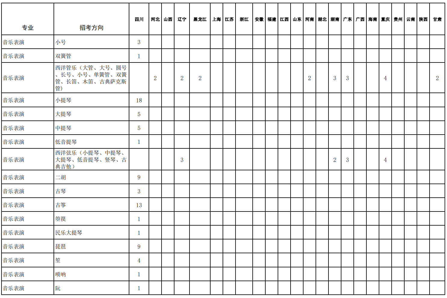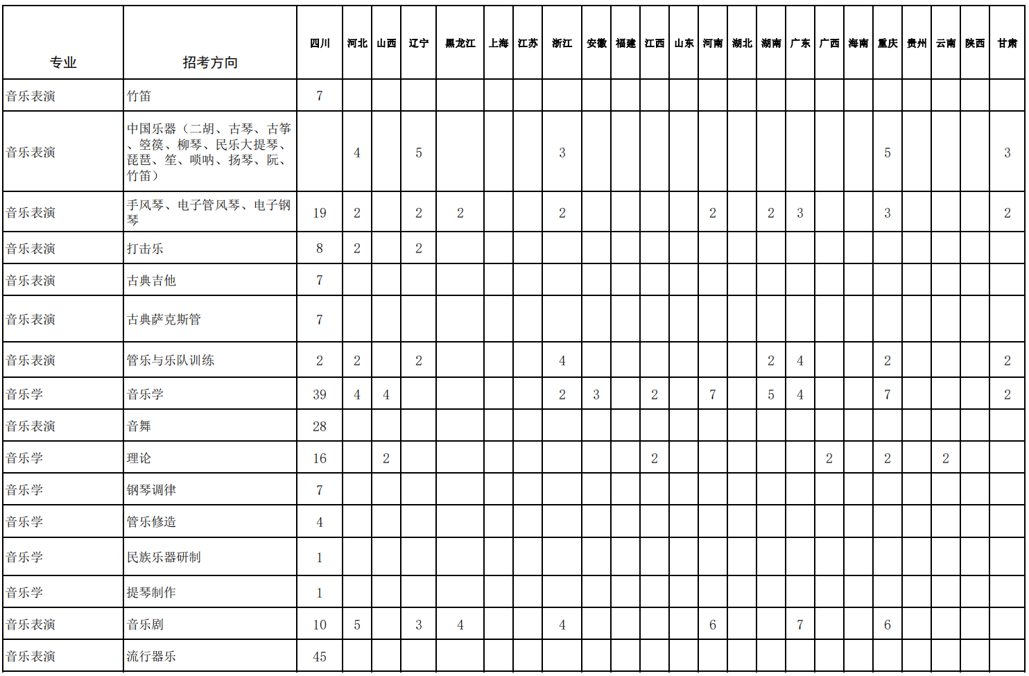 2021年四川音乐学院招生计划已经公布,以下是四川省及全国各专业招生人数,这是填报志愿时非常重要的参考数据,供大家参考,如有变动,以学校官方公布为准: