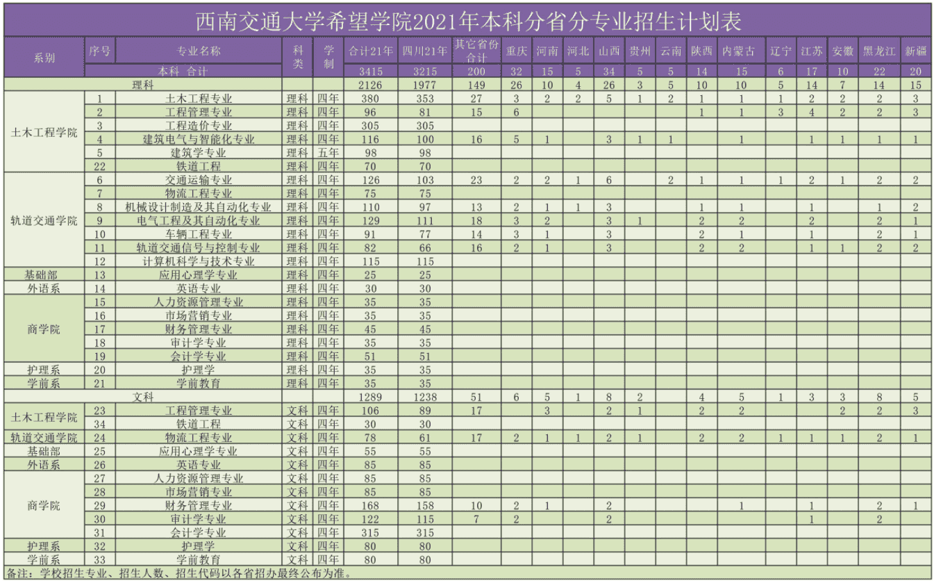 2021年西南交通大学希望学院招生计划已经公布,以下是四川省及全国各专业招生人数,这是填报志愿时非常重要的参考数据,供大家参考,如有变动,以学校官方公布为准: